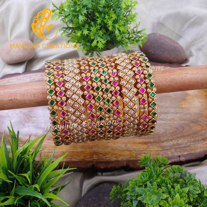 Pretty Kundan Bangles with Gold Pearl Kada Bangles for Women (Set of 10 Bangles).
