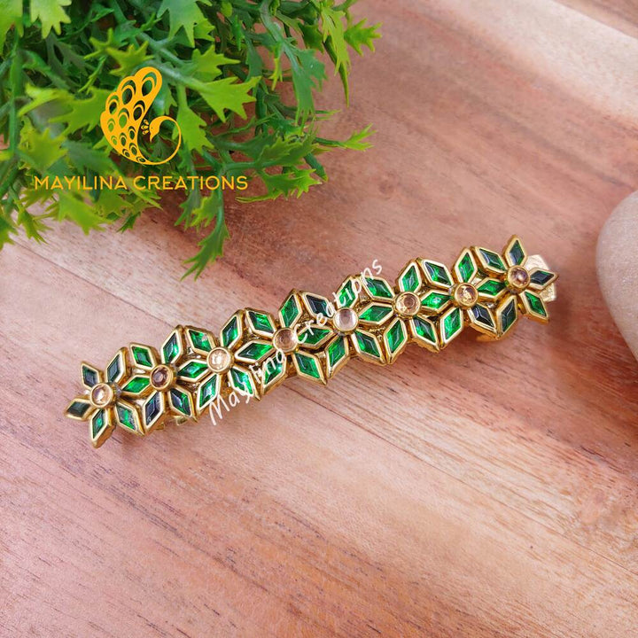 Dark Green Diamond Flower Kundan Large Centre Clip (Size - 8cm). Mayilina Creations is your one stop destination for a handmade silk thread bangles, earrings and saree pins for all occasions. Mayilina Creations provides a perfect bangle with finest finishing, that makes your complete attire unique. We do have perfect return gift bangles for Wedding, Baby Shower, Housewarming, Birthday, Navratri, Diwali, Pooja etc.