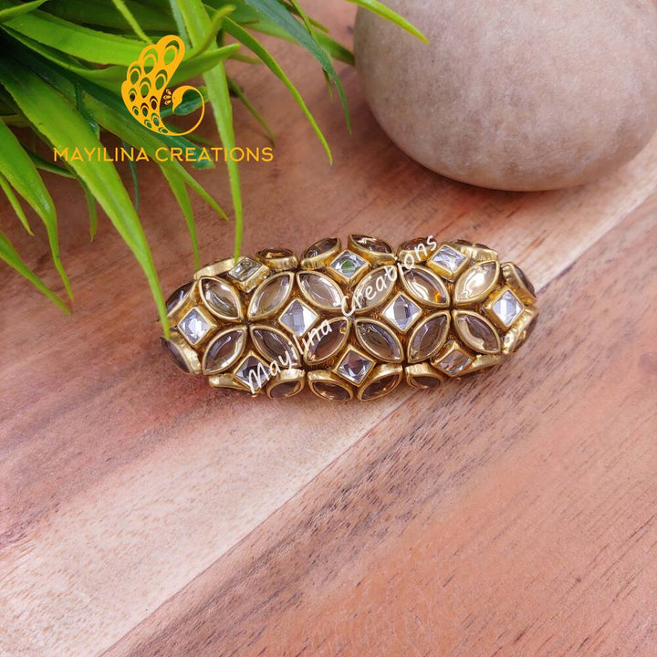 Gold Kundan Saree Pin  (Size - 5cm). Mayilina Creations is your one stop destination for a handmade silk thread bangles, earrings and saree pins for all occasions. Mayilina Creations provides a perfect bangle with finest finishing, that makes your complete attire unique. We do have perfect return gift bangles for Wedding, Baby Shower, Housewarming, Birthday, Navratri, Diwali, Pooja etc.