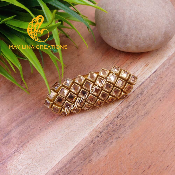 Gold Kundan Saree Pin  (Size - 5cm). Mayilina Creations is your one stop destination for a handmade silk thread bangles, earrings and saree pins for all occasions. Mayilina Creations provides a perfect bangle with finest finishing, that makes your complete attire unique. We do have perfect return gift bangles for Wedding, Baby Shower, Housewarming, Birthday, Navratri, Diwali, Pooja etc.