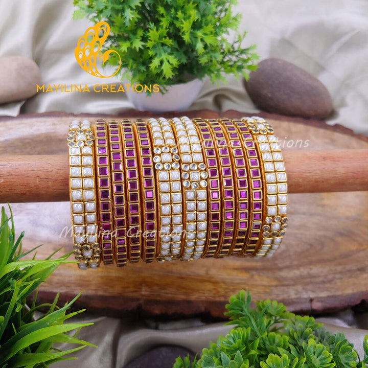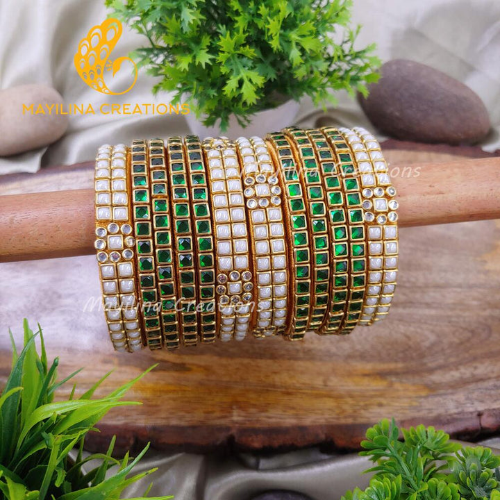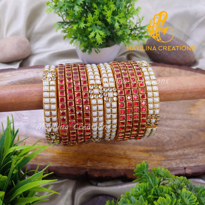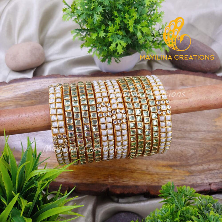 Square Kundan with White Pearl Border Silk Thread Kundan Bangles (Set of 12 Bangles).