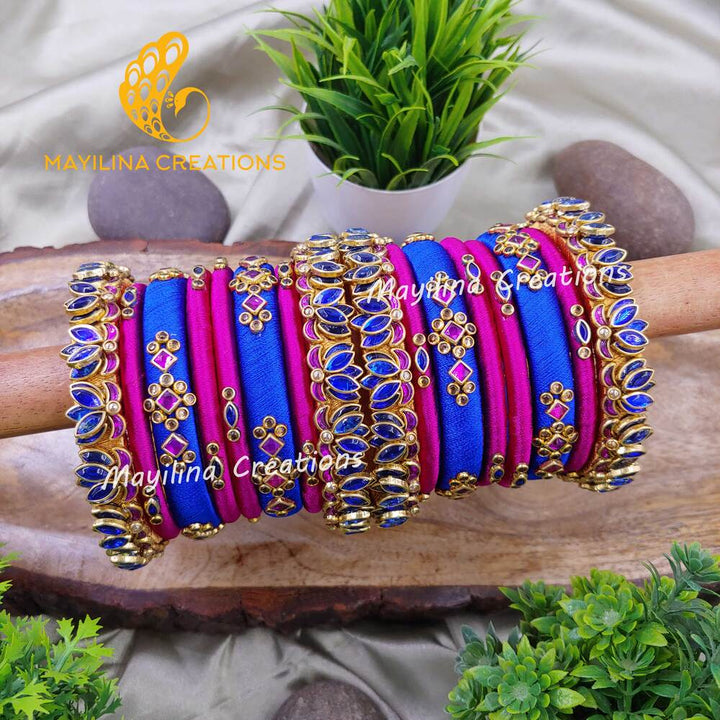 Pink and Blue Lotus Kundan with Lakshmi Coin Silk Thread Bangles for Wedding. Mayilina Creation is your one stop destination for a handmade silk thread bangles, earrings and saree pins for all occasions. Mayilina Creations provides a perfect bangle with finest finishing, that makes your complete attire unique. We do have perfect return gift bangles for Wedding, Baby Shower, Housewarming, Birthday, Navratri, Diwali, Pooja etc.