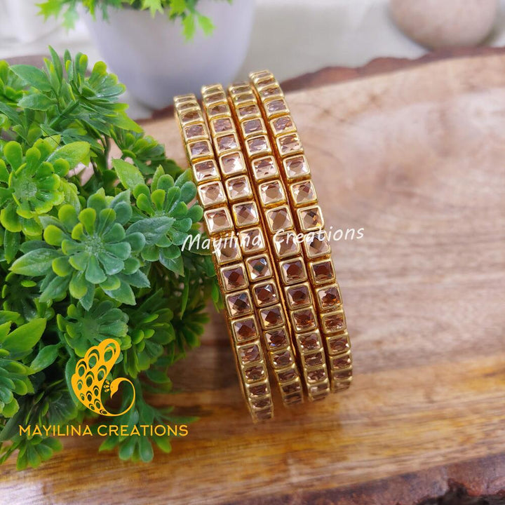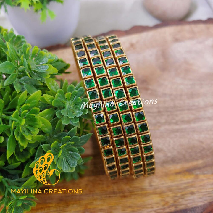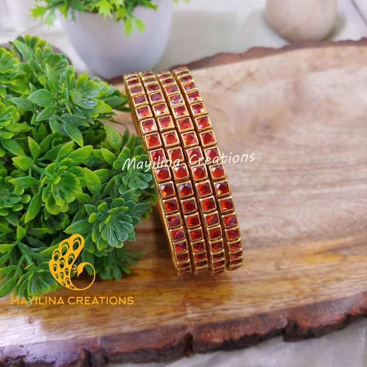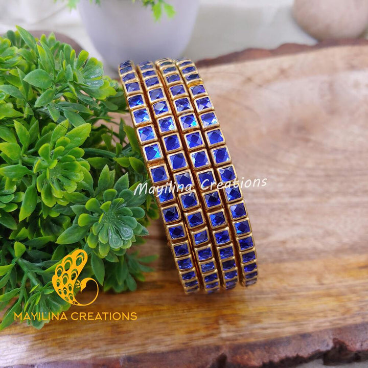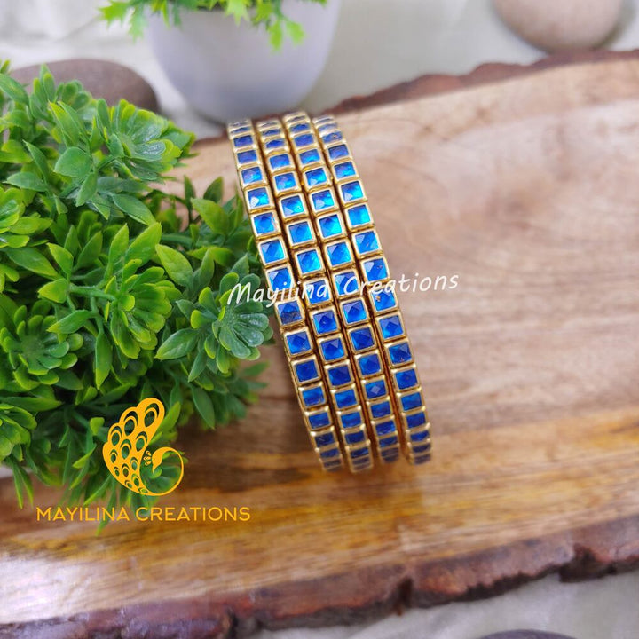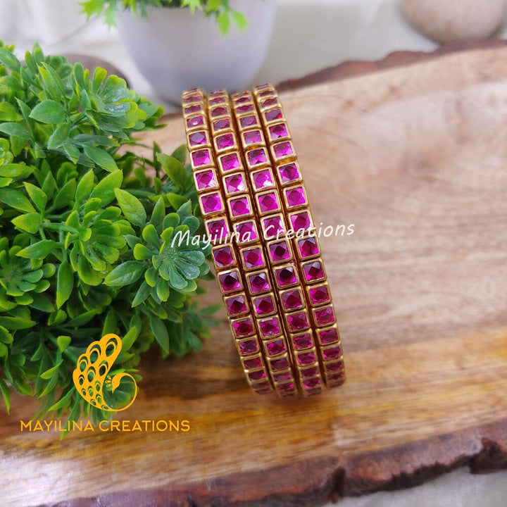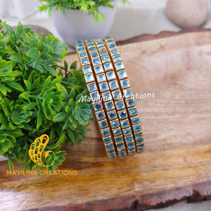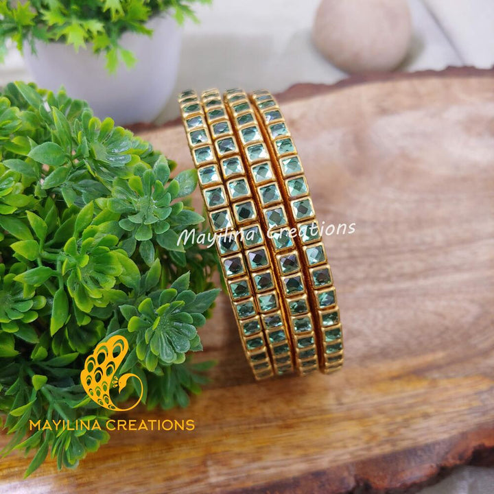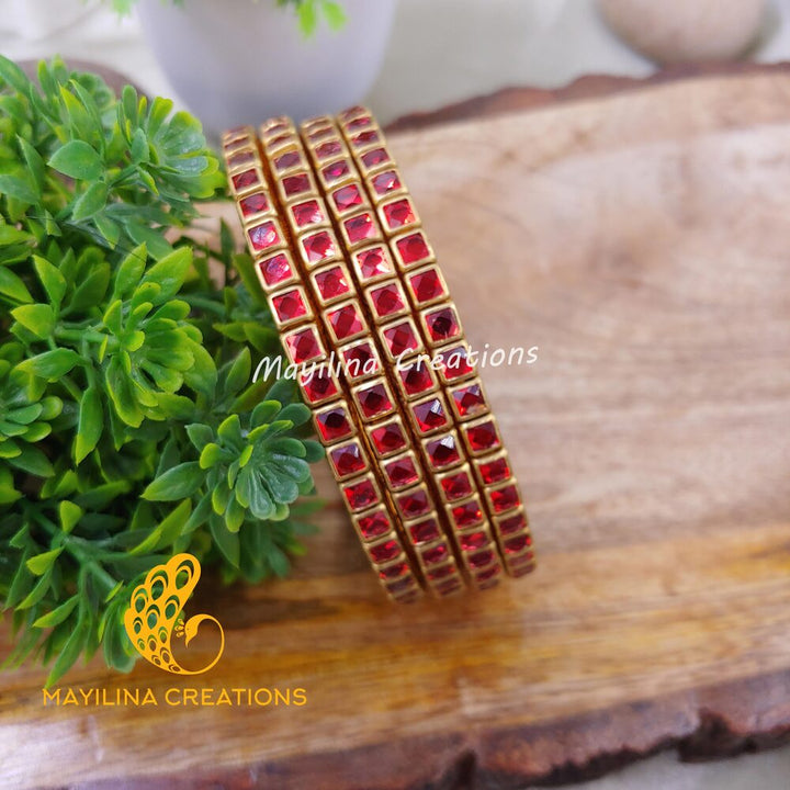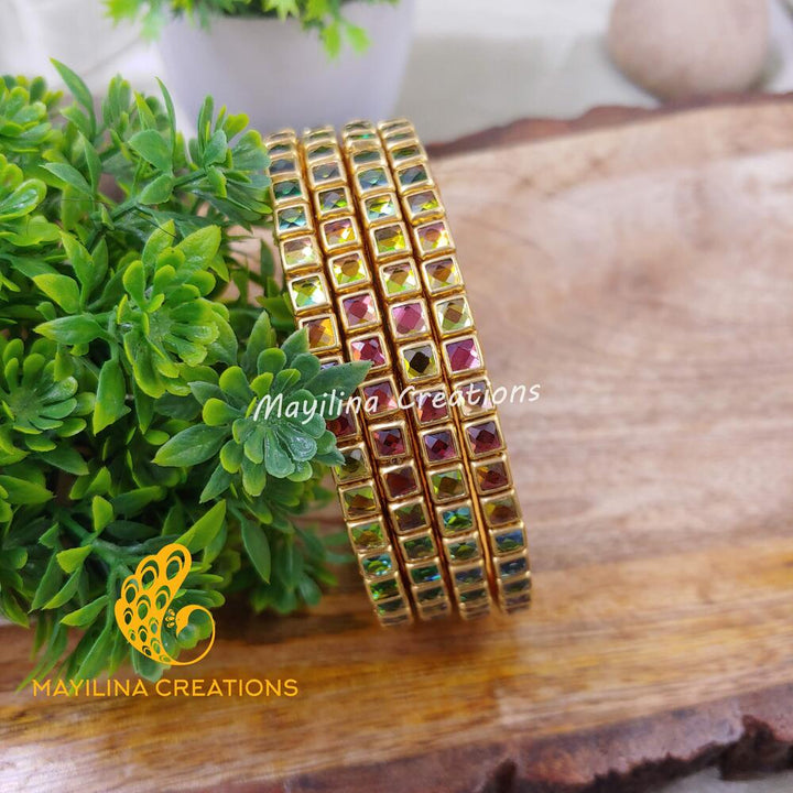 Square Gloss Kundan Single Line Silk Thread Bangles (Set of 4). Mayilina Creation is your one stop destination for a handmade silk thread bangles, earrings and saree pins for all occasions. Mayilina Creations provides a perfect bangle with finest finishing, that makes your complete attire unique. We do have perfect return gift bangles for Wedding, Baby Shower, Housewarming, Birthday, Navratri, Diwali, Pooja etc.