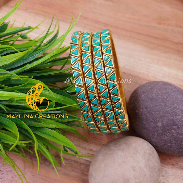 Teal Triangle Pattern Kundan Single Line Silk Thread Bangles (Set of 4)