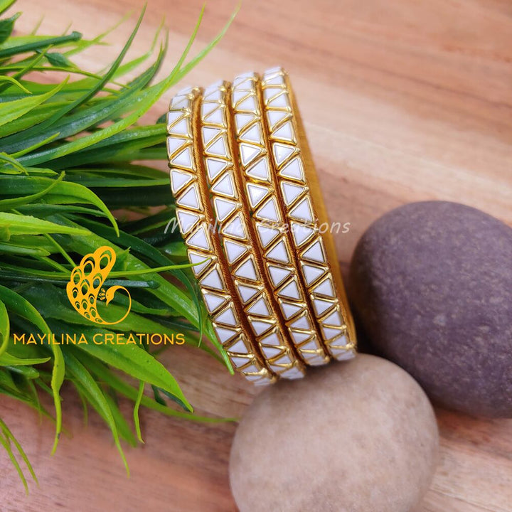 White Triangle Pattern Kundan Single Line Silk Thread Bangles (Set of 4)