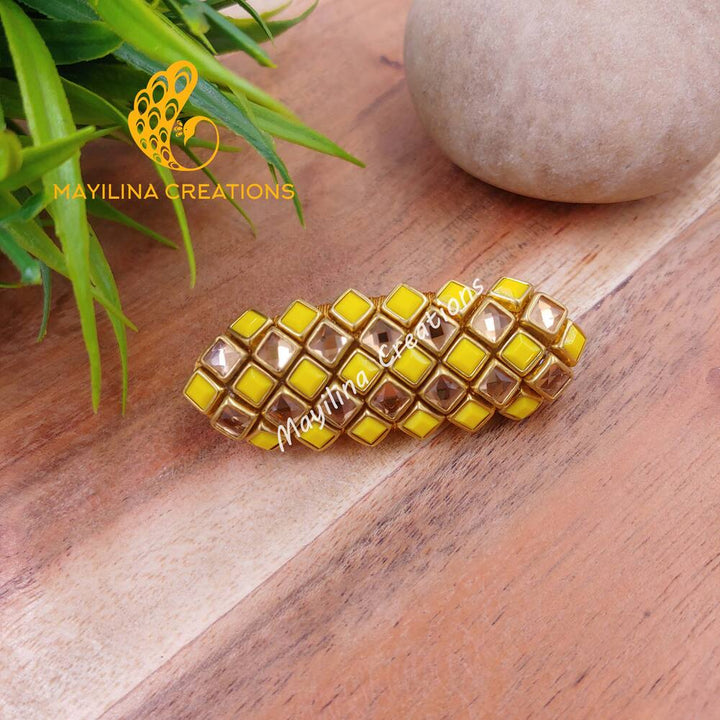 Yellow and Gold Kundan Saree Pin (Size - 5cm). Mayilina Creations is your one stop destination for a handmade silk thread bangles, earrings and saree pins for all occasions. Mayilina Creations provides a perfect bangle with finest finishing, that makes your complete attire unique. We do have perfect return gift bangles for Wedding, Baby Shower, Housewarming, Birthday, Navratri, Diwali, Pooja etc.