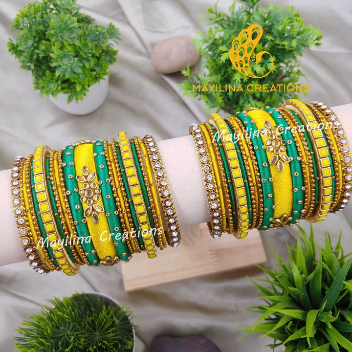 Yellow and Green Kundan Silk Thread Bangles with Metal Bangles for Women, for Wedding
